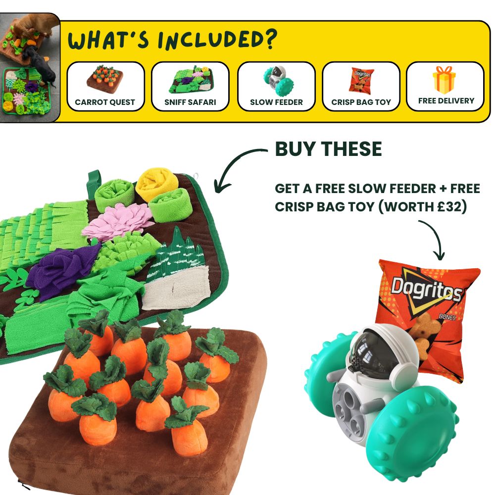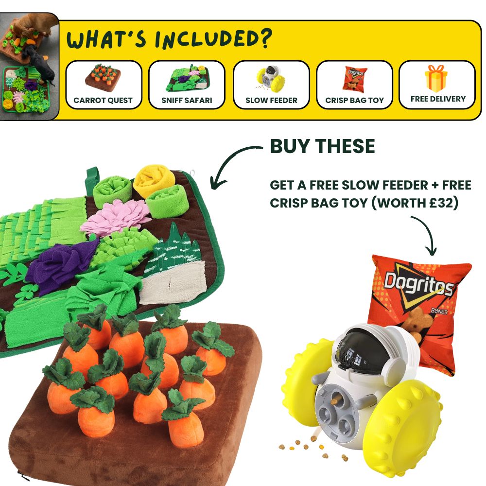 Take your dog's enrichment to the next level with the Brain Boost Explorer! This pack includes the engaging Carrot Quest, the exciting Sniff Safari, and two FREE Crisp Bags.